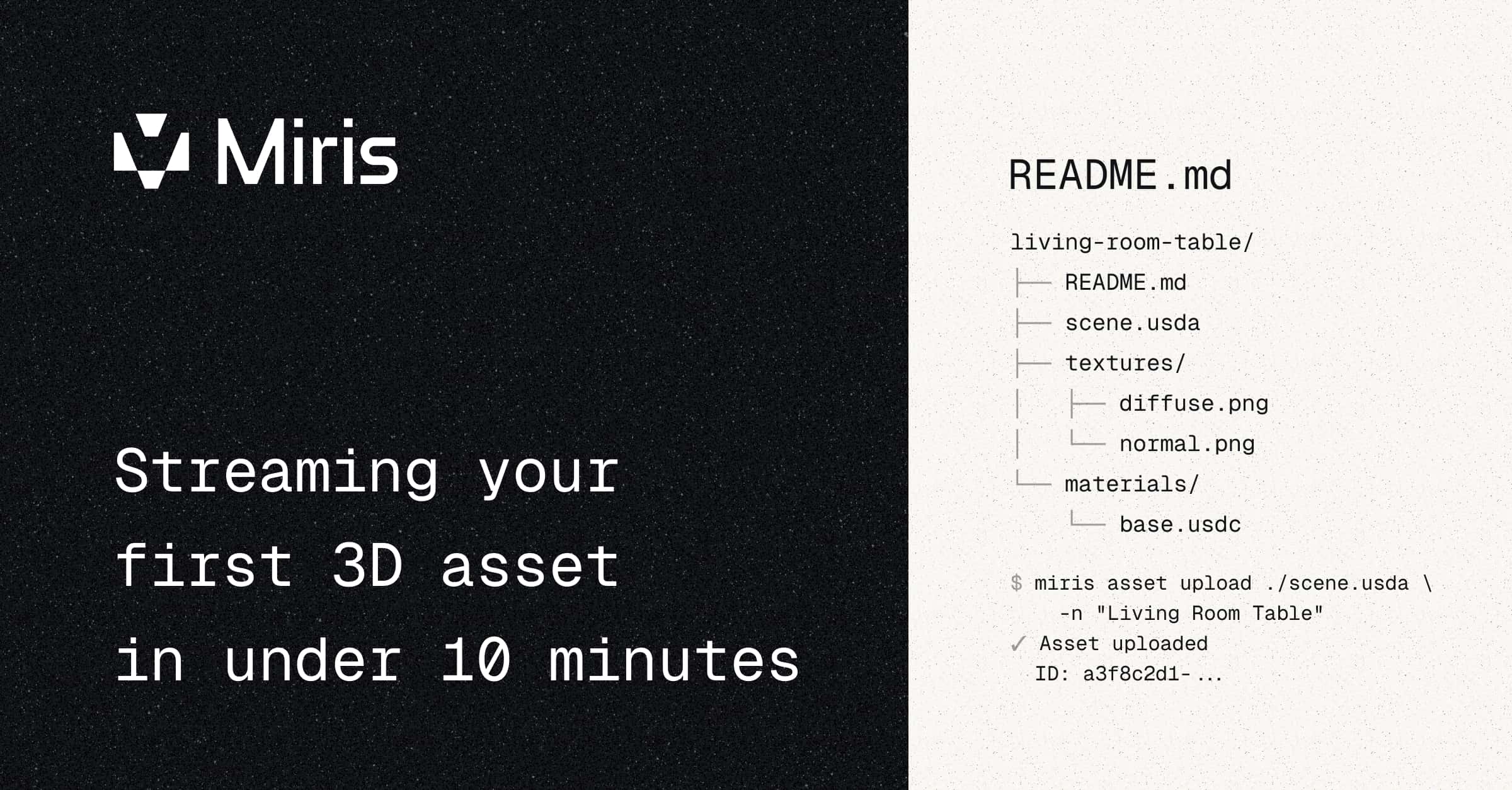 Get access to the full Miris platform from day one. Upload OpenUSD assets up to 10GB, process, stream, and embed with the production SDK. What you build here is what goes to production.